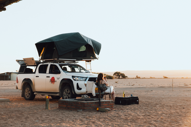 Le roadtrip avec Namibia Nomads est conçu pour 2 à 4 personnes : vous partagez la voiture avec vos compagnons de voyage et dormez ensemble dans une tente de toit.