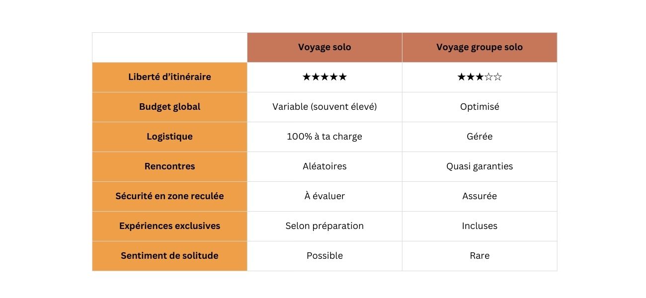 • Voyage solo = liberté totale, mais logistique 100% à ta charge et parfois… solitude pour de vrai !